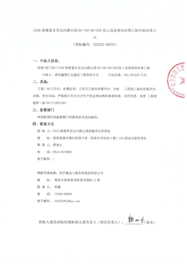 保标招标 > 边坡治理 > 中标信息 > G345商南富水至过风楼公路K6+160-K6+280段上边坡滑坡治理工程中标结果公示